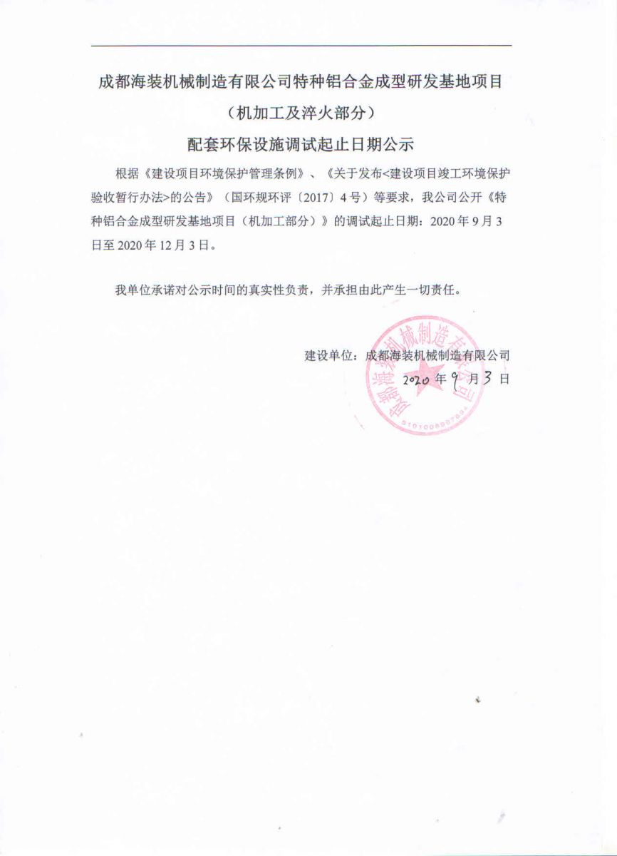 成都海裝機械制造有限公司特種鋁合金成型研發基地項目(機加工及淬火部分)配套環保設施調試起止日期公示