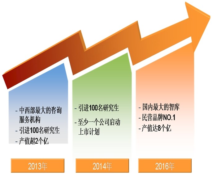 本公司是以人才為依托,以市場為導向,致力于打造中國第一流的技術咨詢團隊。目前已形成員工500余人、產值近2億元、服務資質18個、業務范圍11個省的初步規模,但技術力量還比較薄弱,服務范圍還不理想,公司的影響力比較有限。在公司擬在成立十周年之際,緊抓十八屆三中全會所帶來的歷史機遇,苦練內功,改革創新,挖掘潛力,用3-5年時間,使公司員工達到1500人、產值達到8-10億元、努力成為中國最有影響的技術咨詢單位之一。5-10年以后,眾望咨詢業務將覆蓋全國并走向世界,打造1-2個上市公司,業務范疇將向技術研究、創造發明、企業設計、戰略開發、組織結構、經營運作等方面拓展,成為中國的“麥肯錫”……